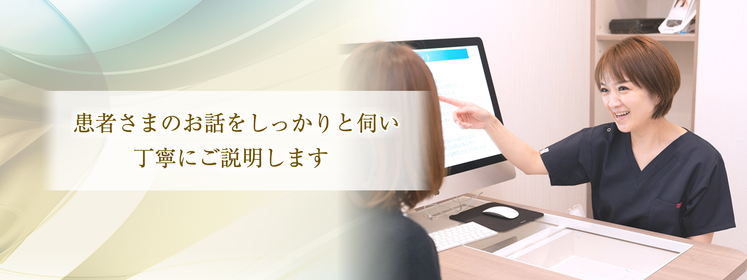患者さまの目線に立ったコミュニケーションを心がけています。治療の前には、カウンセリングルームで検査結果や治療計画をご説明。お口の中を撮影するカメラや資料などを使いながら丁寧にお伝えし、ご納得を得られてから診療をスタートします。